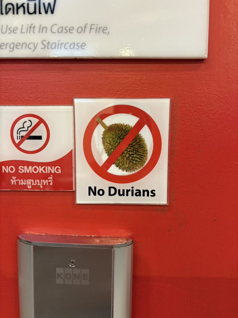 余談ですが‥‥1日目のホテルのエレベーターで撮った注意書き。バンコクの多くのホテルに同じ注意書きがありました。ドリアン、そんなにヤバいの‥‥?