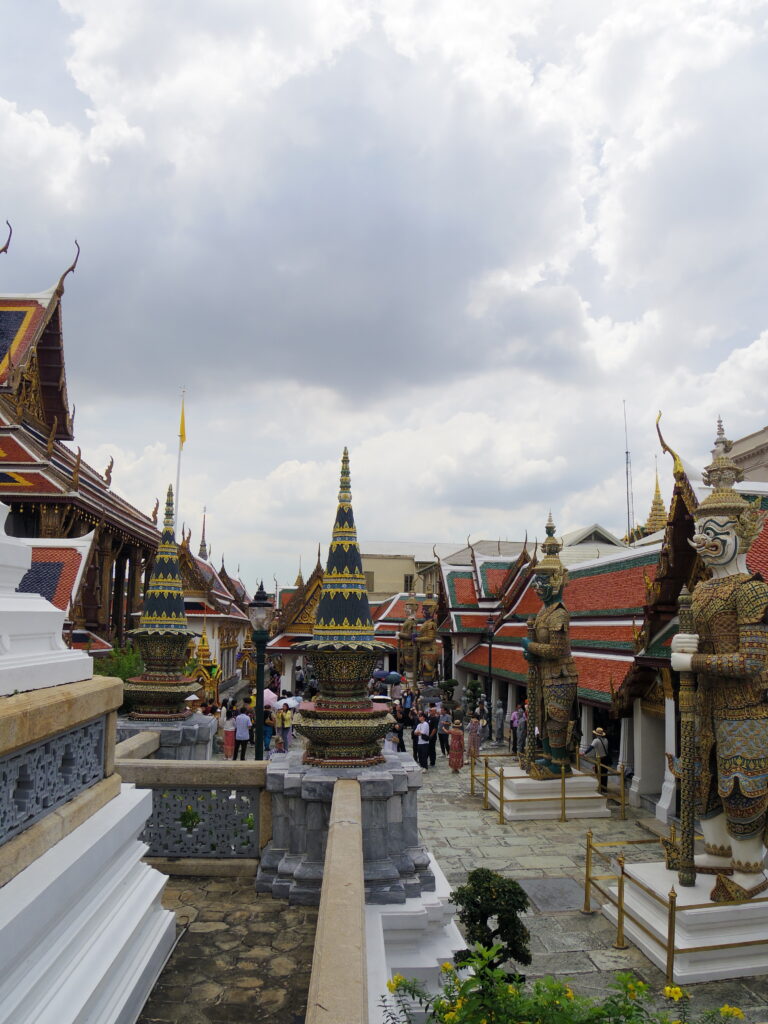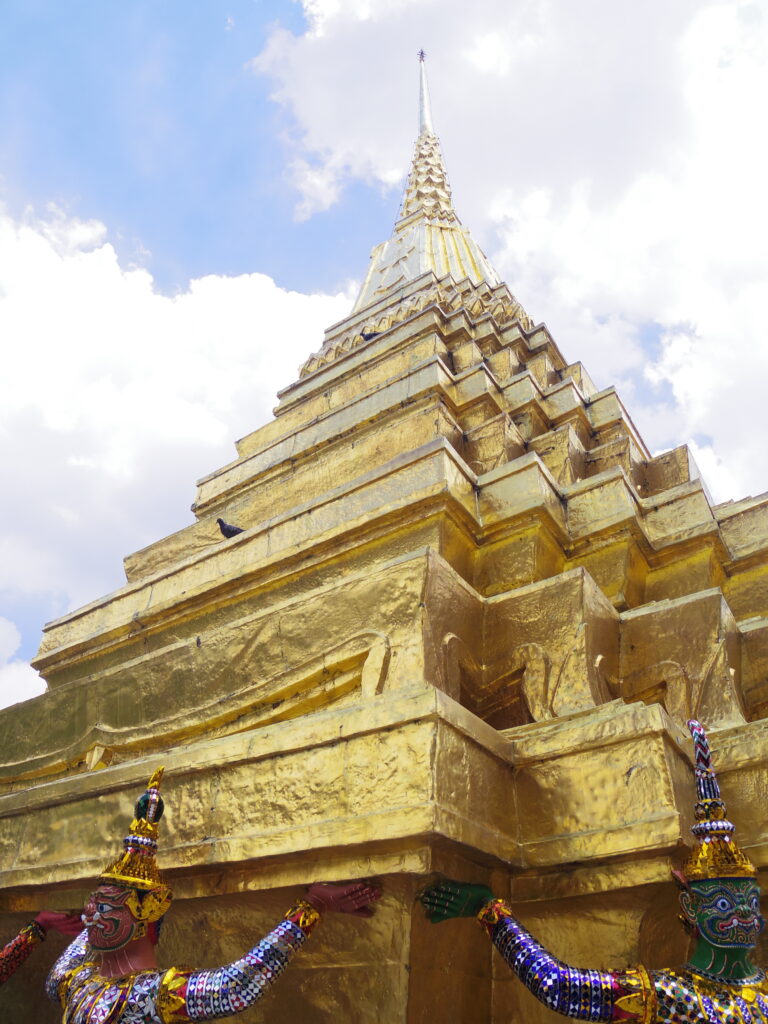 ボートに乗って対岸に戻って、次はワット・プラ・ケオへ。建物自体は目の前にあるのですが、入り口が遠く、入場するまでにかなり歩きました。入場料は500バーツ、最高額です。仏塔「プラ・シー・ラタナ・チェディ」はとーってもきらびやか。キンキラピカピカです!なぜかアンコールワットらしき建物の模型も。このころになるとピークの時間帯なのか、観光客でだいぶごった返していました。暑い中休まずずっと歩き続けてきたことで疲労困憊だったこともあり、早々に後にしました。王宮などほかにもいろいろ見て回れたらよかったのですが、次また来た時のお楽しみとしてとっておきます。