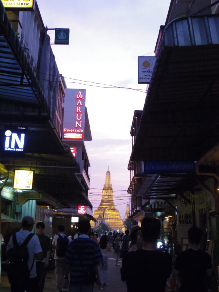 昼寝をして体を少し休めたら、晩御飯探しの旅に夕暮れの街を散策。一休みたまたま通りかかったところが、ワット・アルンのフォトスポットでした。夕暮れの茜色の空をバックにそびえるワット・アルンの美しさに、通行人の全員が息をのんでいました。これは一生忘れられない光景です。カメラに収めようと必死にシャッターを切りましたが、写真のデータよりも自分の目で直接見た景色の方が何十倍も綺麗だったと思います。こういう偶然の出会いが、旅の醍醐味だなと感じます。