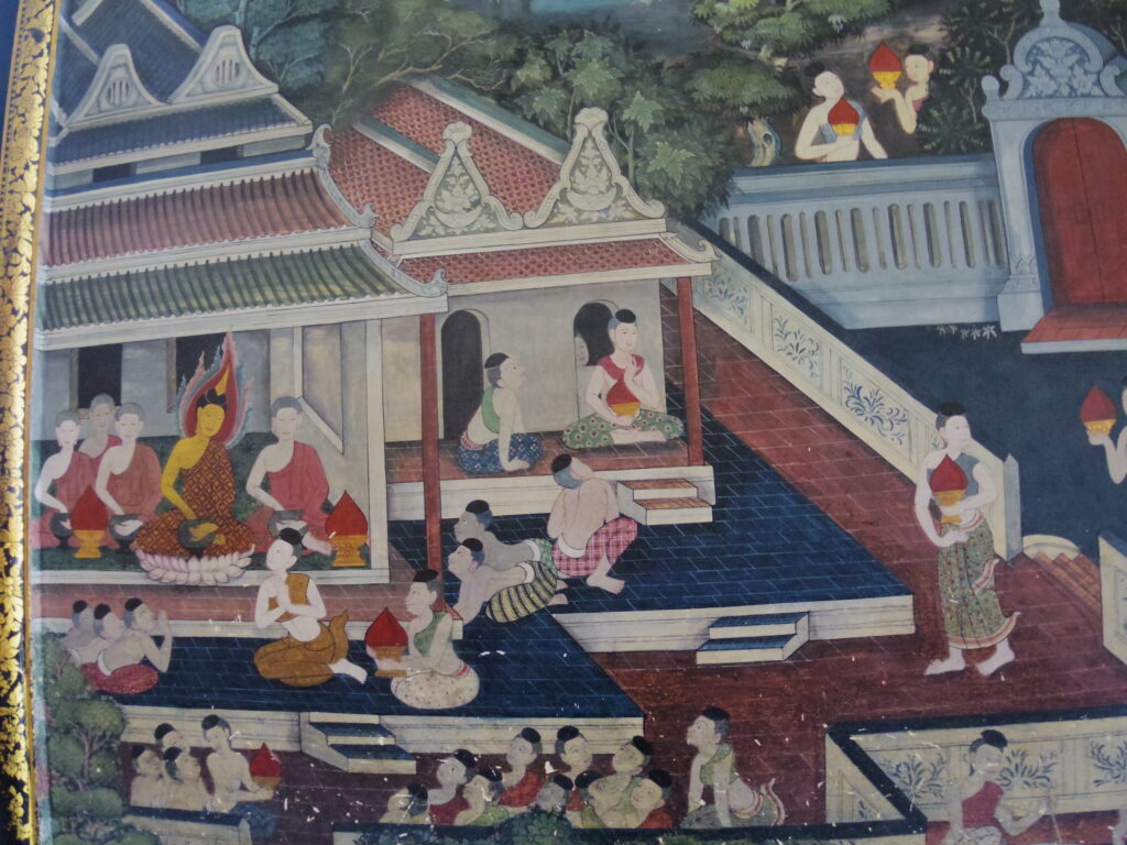 それでもやはりカメラに収まりきらないほどのその大きさは圧巻でした。また、仏像の足の裏には、仏教の世界観を現した美しい螺鈿細工で刻まれています。そして涅槃仏が横たわる室内の壁は、一面絵で絵でおおわれています。絵のタッチや色遣いが日本の歴史画と似た感じがあって、驚きました。みんな涅槃仏にばかり目を奪われて、周囲の壁画に目をやらないのはもったいないなと感じました。訪れた際はぜひじっくり見てあげてください。